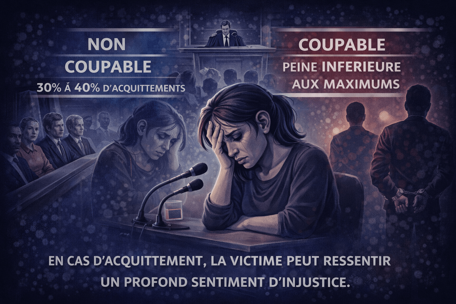 Le viol, crime passible de 20 ans, est régulièrement requalifié en délit d'agression sexuelle. La gravité des faits est ainsi minimisée par le système lui-même.