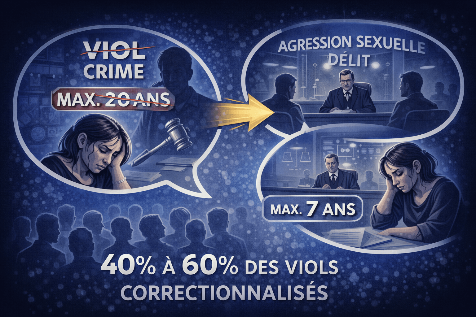 Le viol, crime passible de 20 ans, est régulièrement requalifié en délit d'agression sexuelle. La gravité des faits est ainsi minimisée par le système lui-même.